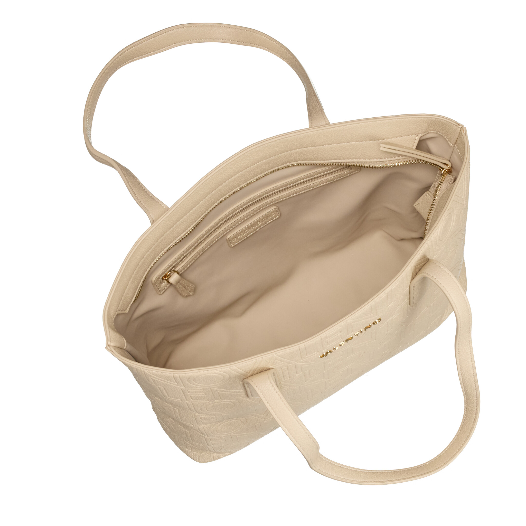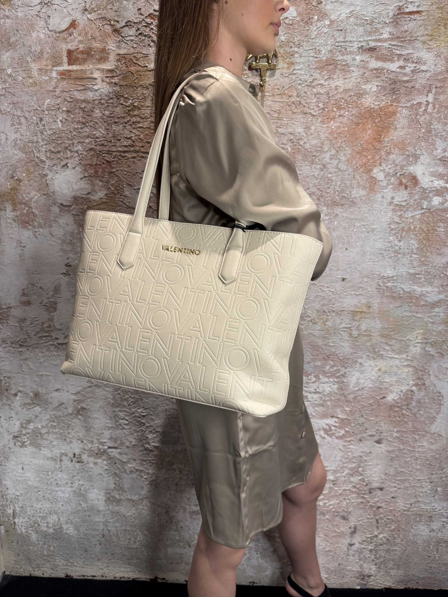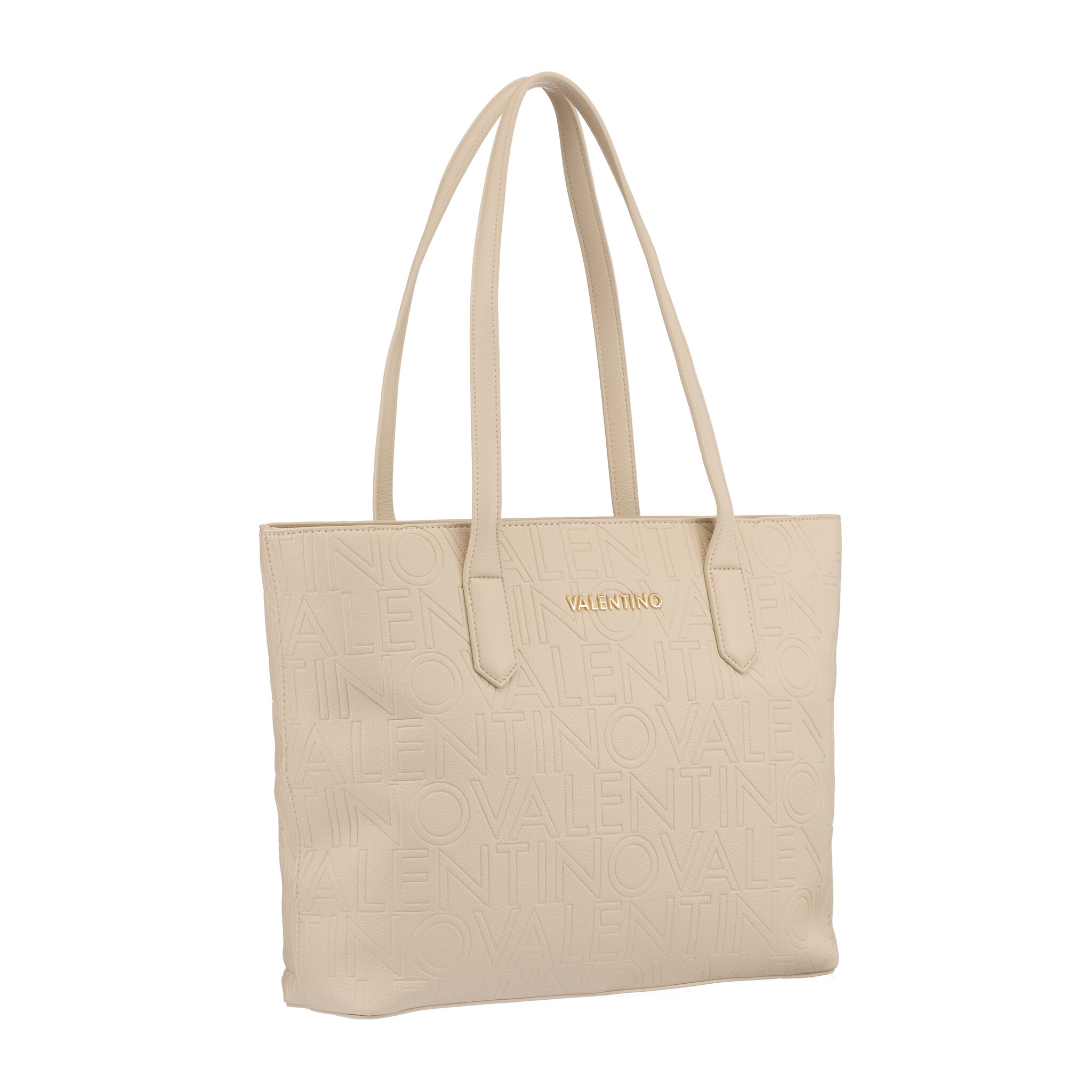 Valentino Pansy Shopping Ecru VBS8PG01: Elegante shopper in ecru met all-over reliëflogo en goudkleurig merkembleem. Ruim hoofdvak met rits, binnenvak en lange hengsels voor comfortabel dragen. Perfect voor stijlvol dagelijks gebruik.