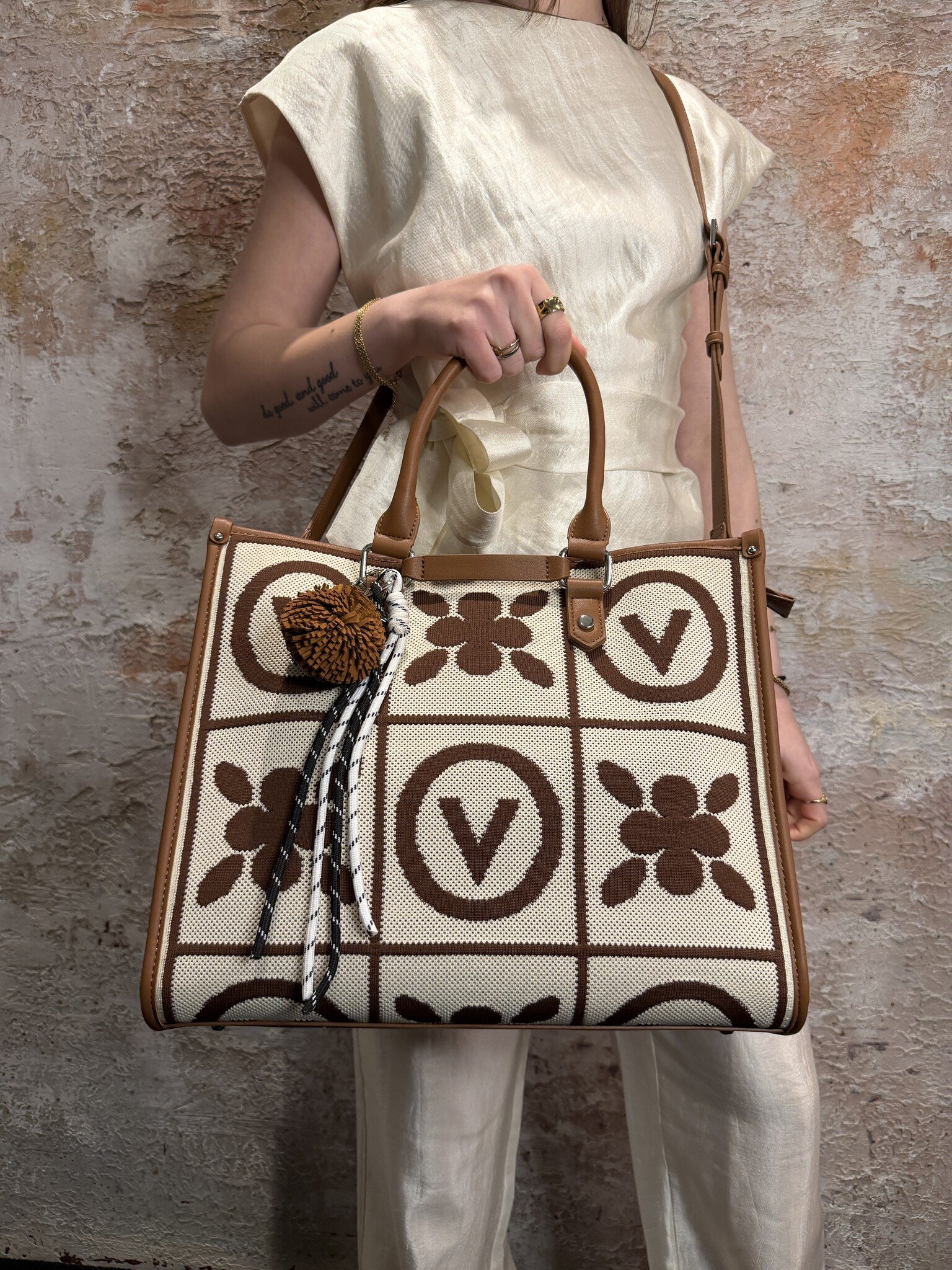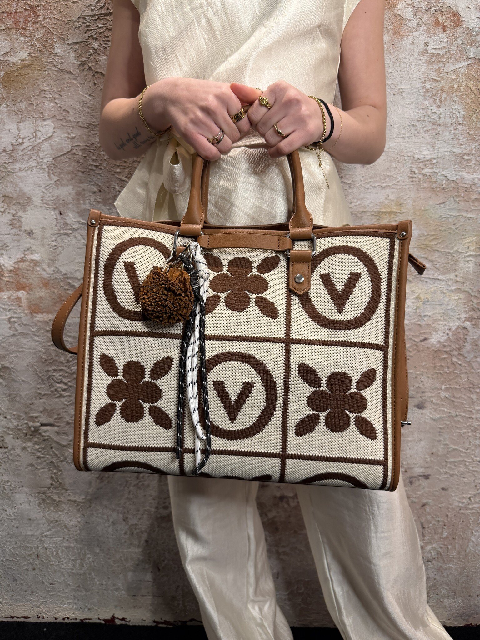 Valentino Tyle Shopping Bag in cuoio met ruim formaat en opvallend jacquard patroon. Afgewerkt met luxe leren details, stevige handvatten en afneembare schouderband. Perfect voor dagelijks gebruik met een stijlvolle en praktische uitstraling.