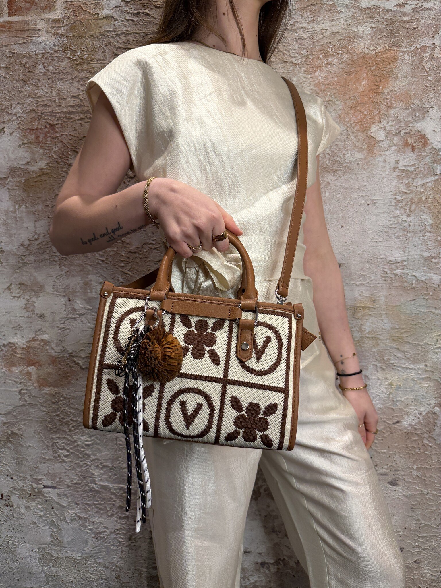 Valentino Tyle Shopping Bag in cuoio met opvallend jacquard patroon en luxe leren details. Voorzien van stevige handvatten en afneembare schouderband. Stijlvol en praktisch, perfect voor dagelijks gebruik met een unieke uitstraling.
