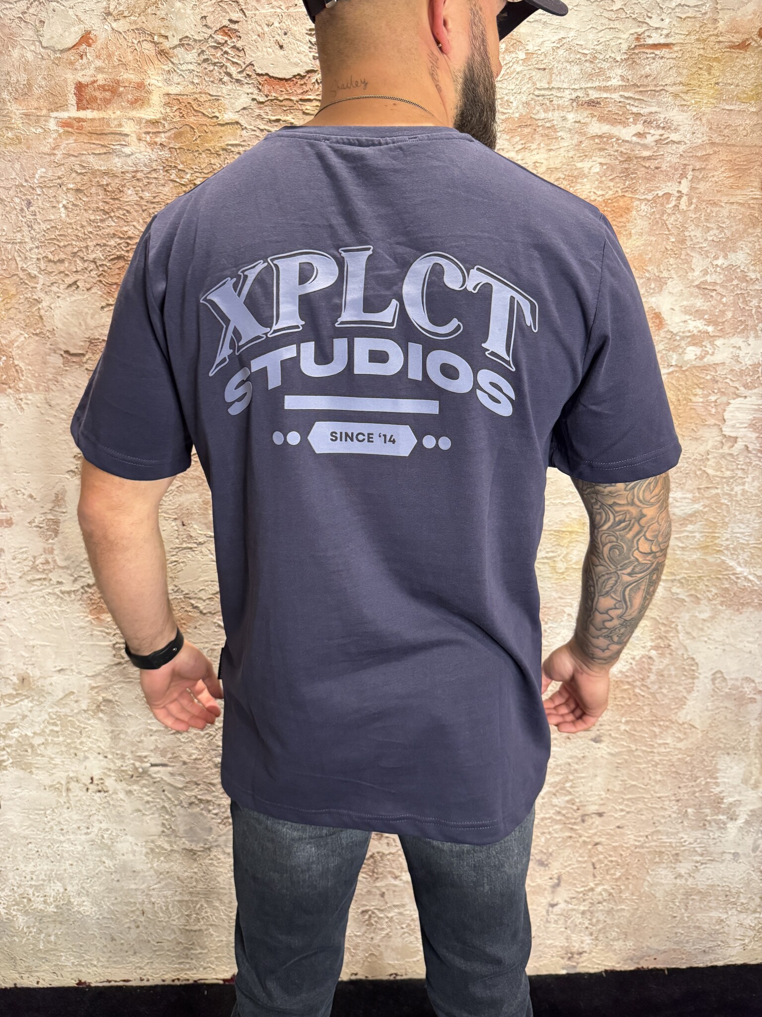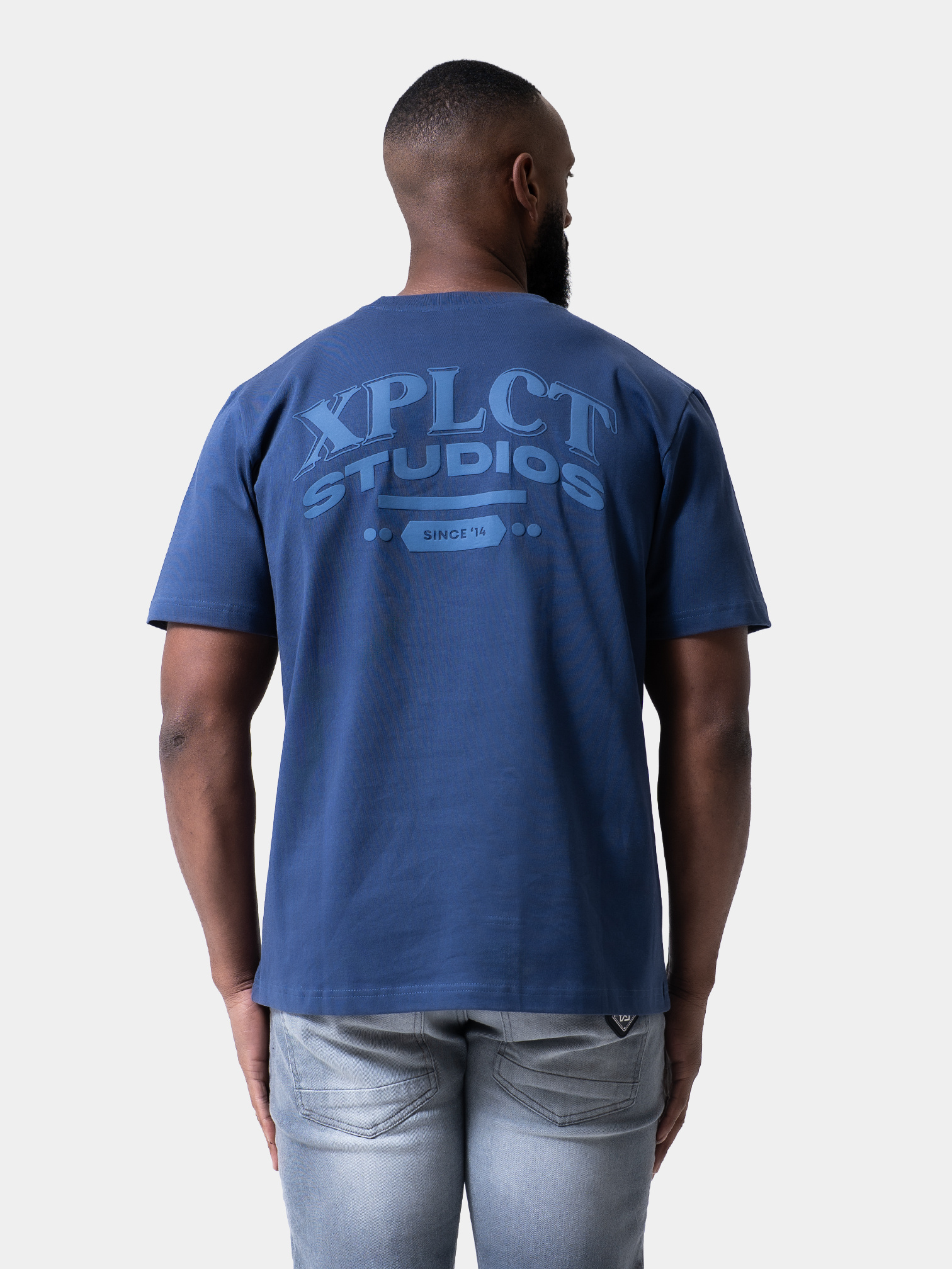 XPLCT Hybrid Tee Navy – Navy blauw T-shirt van XPLCT Studios met logo op de borst en grote backprint. Gemaakt van premium katoen, regular fit en modern design. Perfect voor een casual of streetwear outfit.