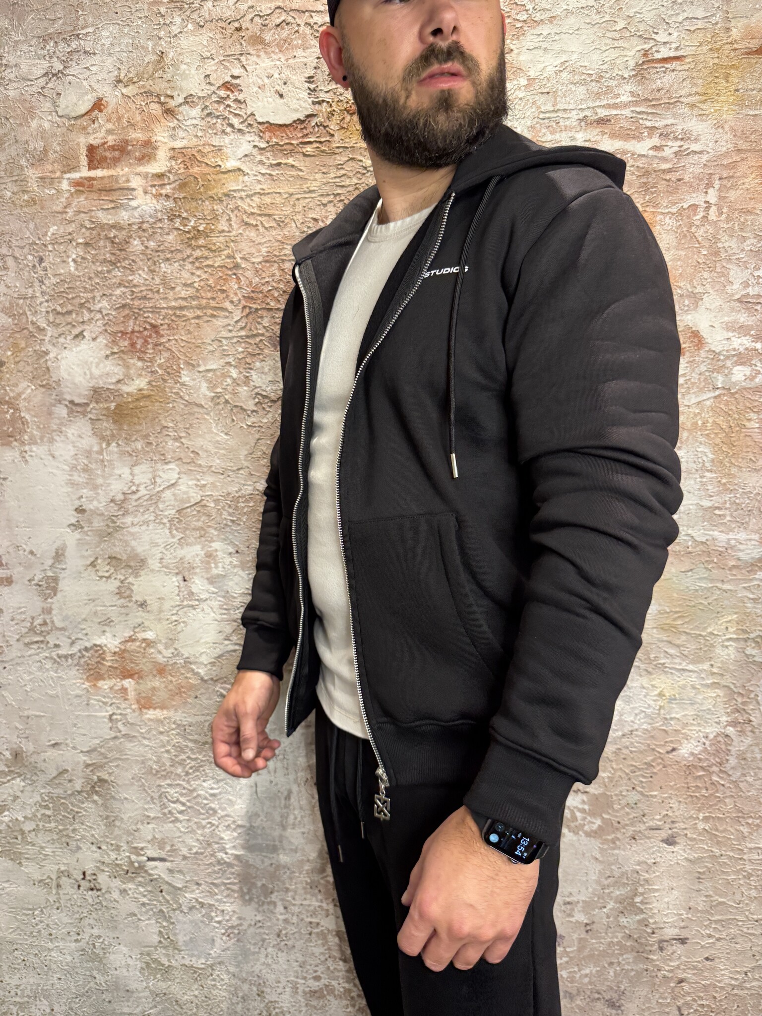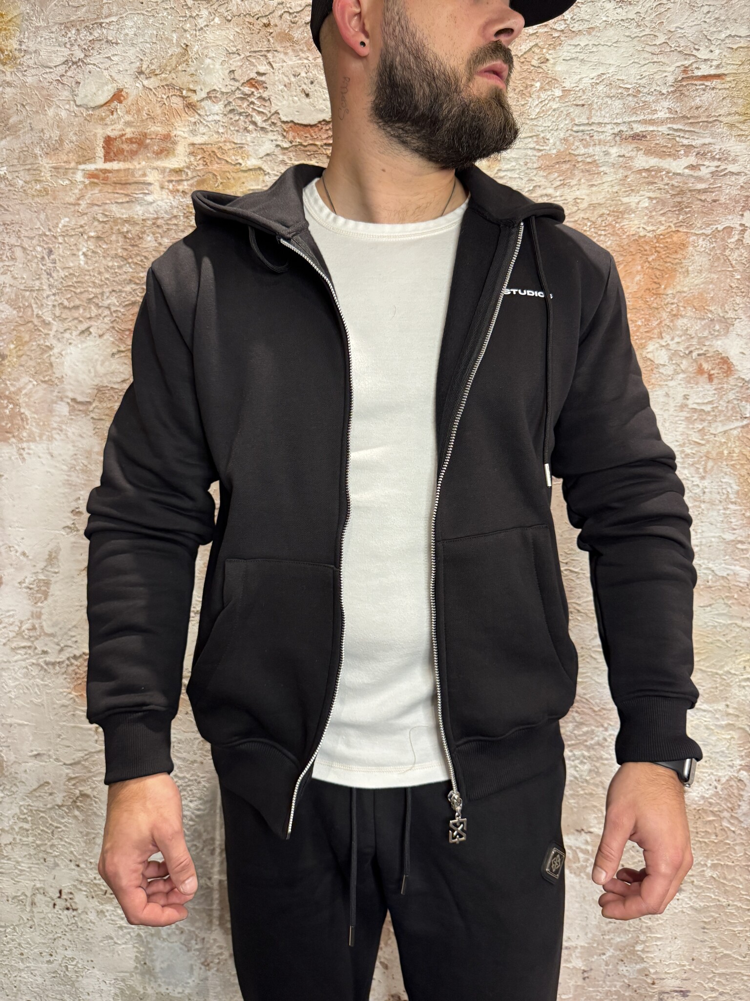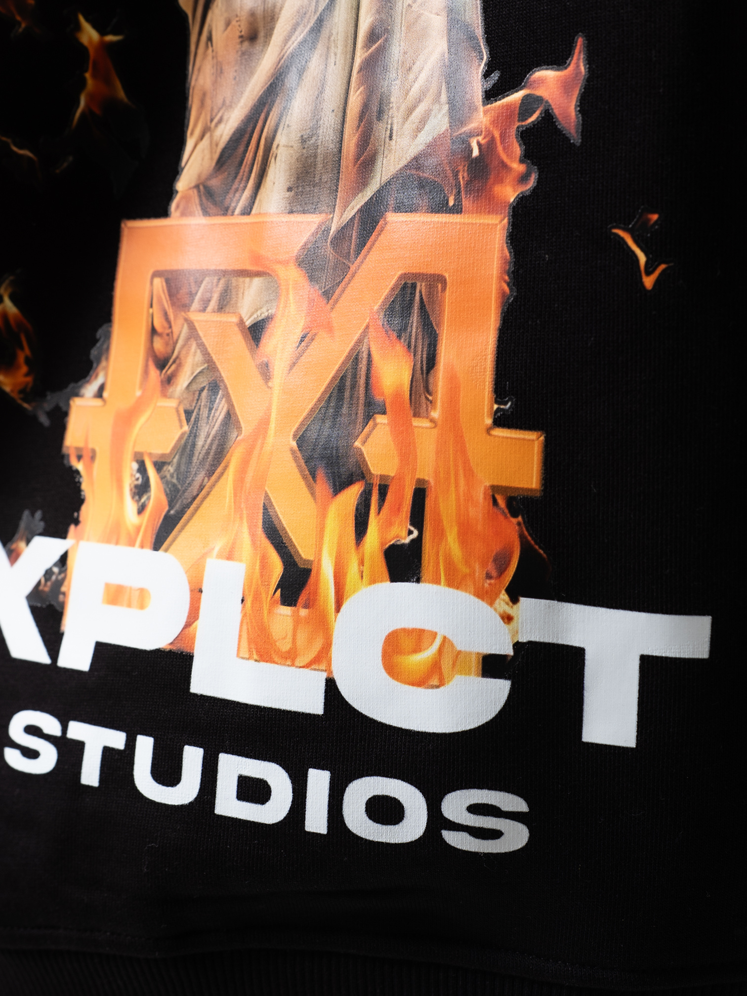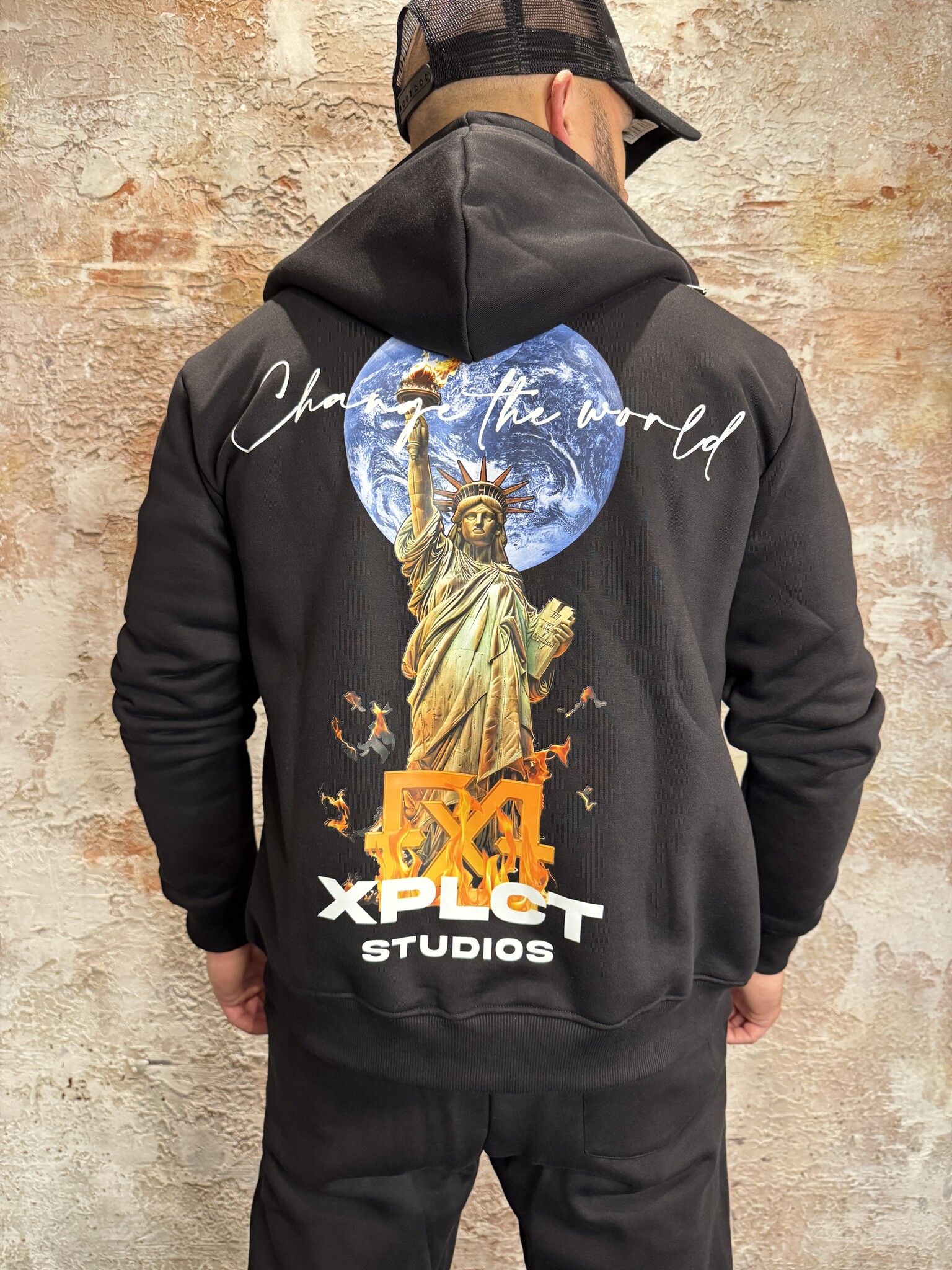 XPLCT Liberty Vest Black. Zwarte zip hoodie van XPLCT Studios met minimalistisch logo op de borst en opvallende backprint van het Vrijheidsbeeld met “Change the world”-design. Comfortabele pasvorm, premium katoenmix en streetwear uitstraling.