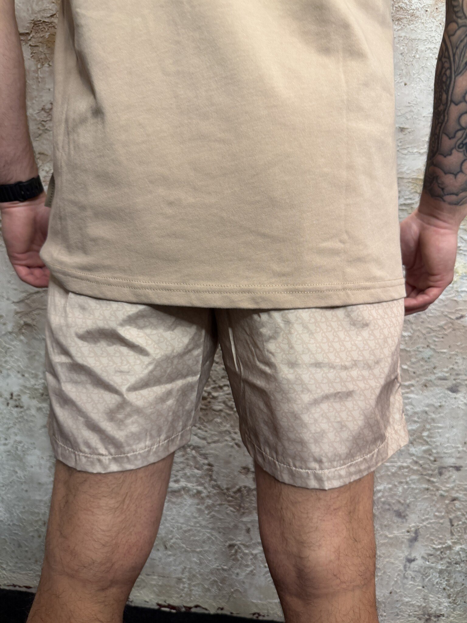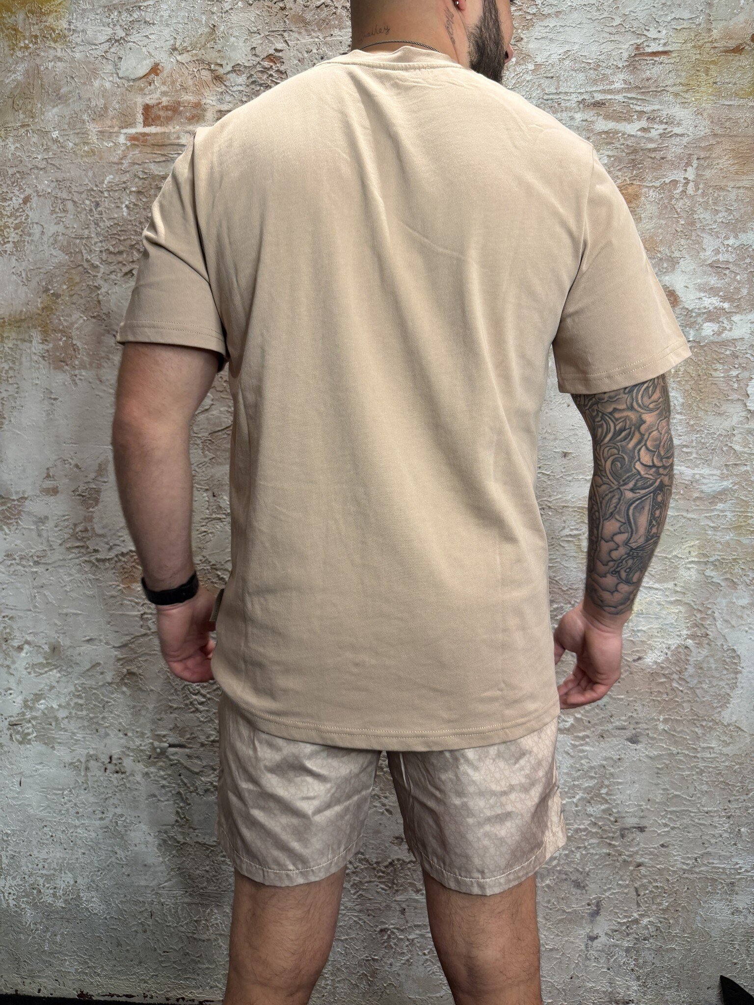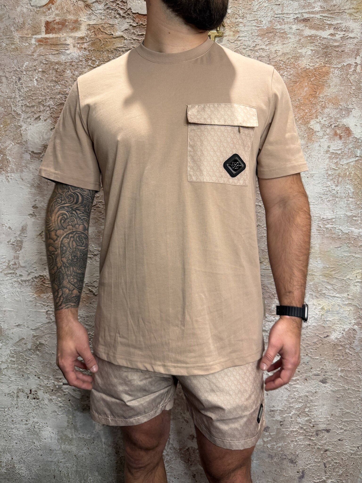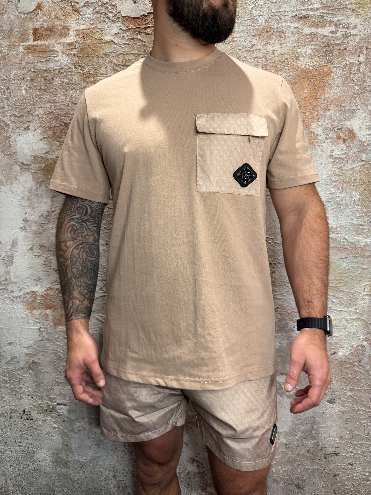 XPLCT Shadow Swim Short Set Beige met matching T-shirt en swimshort. Comfortabele pasvorm, zachte kwaliteit en subtiele all-over print. Sportieve beige kleur met borstzak detail. Perfect voor strand, vakantie of casual zomerse look. Stijlvol en veelzijdig
